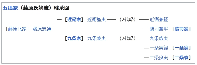 鎌倉時代に入ると、藤原氏の嫡流は近衛家(後に首相となる近衛文麿の氏族)・鷹司家(松平信平の氏族)・九条家・二条家・一条家の五摂家に分立した。