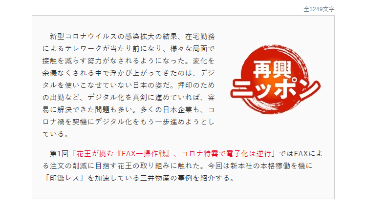 今年6月に東京・大手町の新本社を本格移動させた三井物産が「印鑑レス」を加速させている。電子署名サービス大手の米ドキュサインのサービスを全社に導入。新型コロナウイルスの脅威がまだ広がっていなかった今年2月と比較すると、今年6月の利用数は10倍以上になった。