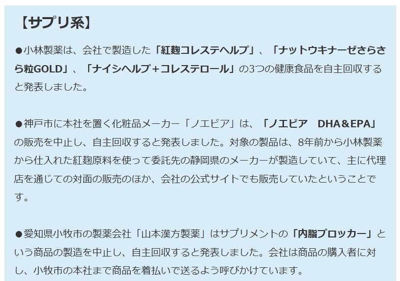 ●小林製薬は、会社で製造した「紅麹コレステヘルプ」、「ナットウキナーゼさらさら粒GOLD」、「ナイシヘルプ+コレステロール」の3つの健康食品を自主回収すると発表しました。