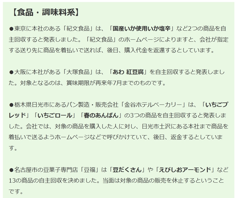 ●東京に本社のある「紀文食品」は、「国産いか使用いか塩辛」など2つの商品を自主回収すると発表しました。「紀文食品」のホームページによりますと、会社が指定する送り先に商品を着払いで送れば、後日、購入代金を返還するとしています。