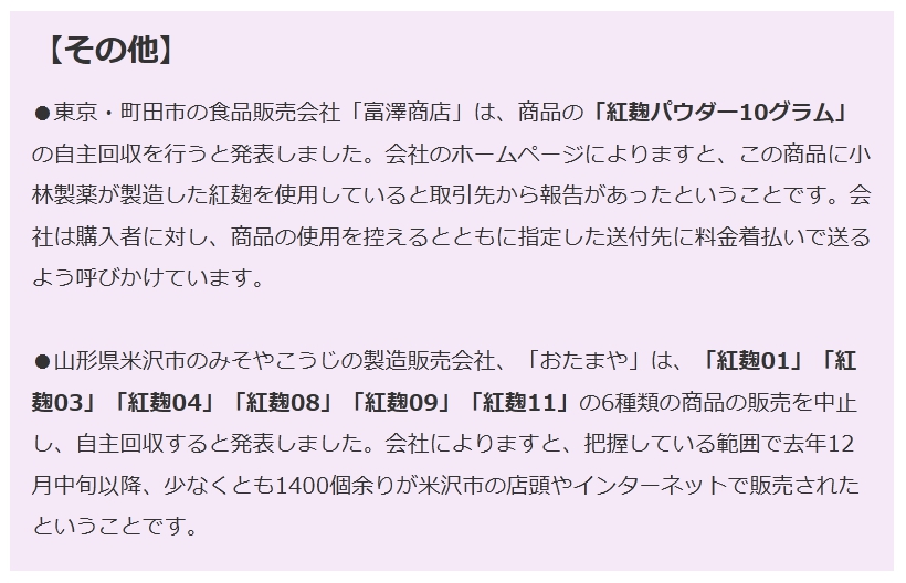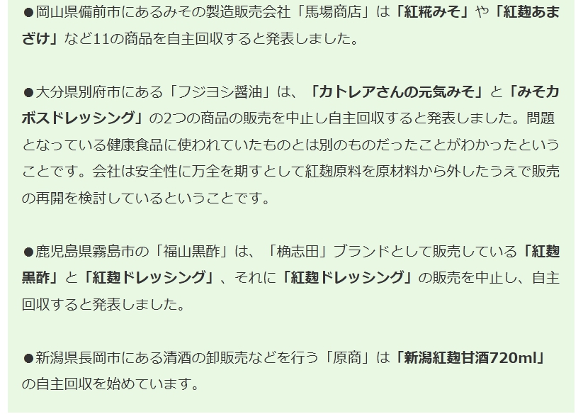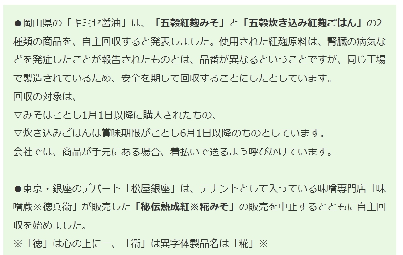 ●岡山県の「キミセ醤油」は、「五穀紅麹みそ」と「五穀炊き込み紅麹ごはん」の2種類の商品を、自主回収すると発表しました。使用された紅麹原料は、腎臓の病気などを発症したことが報告されたものとは、品番が異なるということですが、同じ工場で製造されているため、安全を期して回収することにしたとしています。
