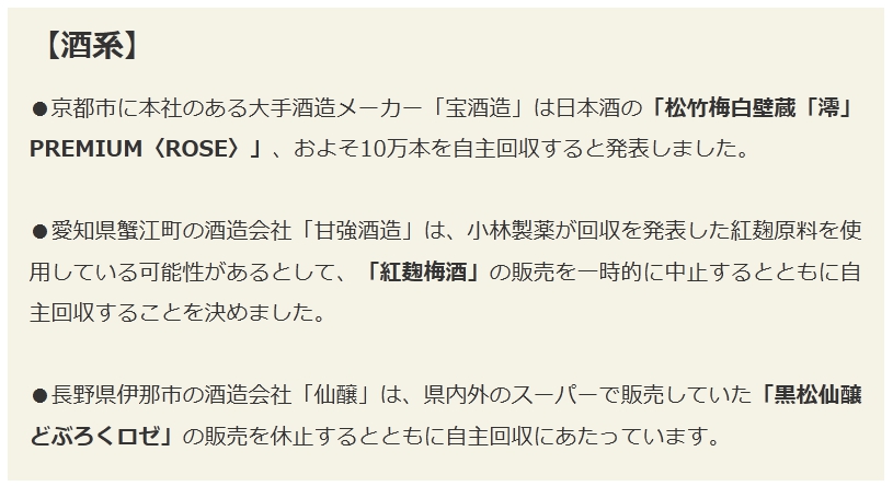 ●愛知県蟹江町の酒造会社「甘強酒造」は、小林製薬が回収を発表した紅麹原料を使用している可能性があるとして、「紅麹梅酒」の販売を一時的に中止するとともに自主回収することを決めました。