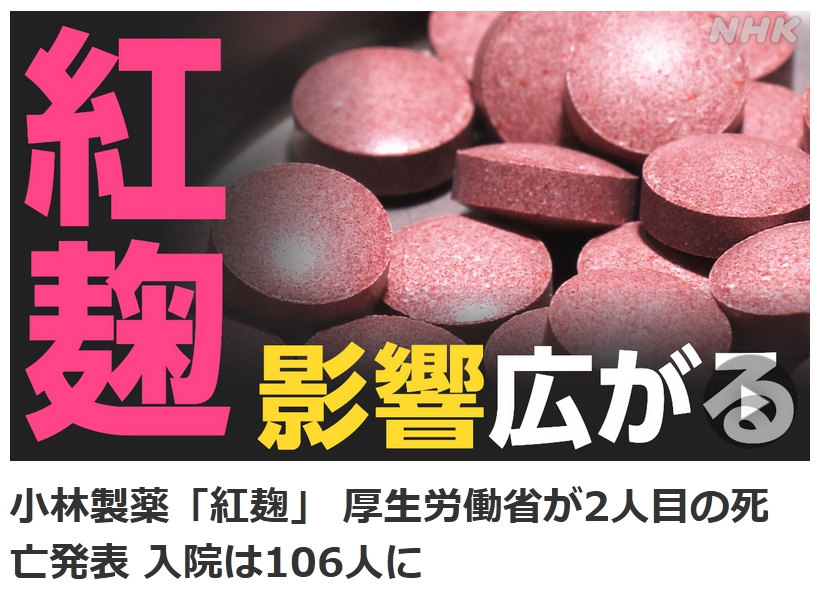 小林製薬「紅麹」 厚生労働省が2人目の死亡発表 入院は106人にhttps://www3.nhk.or.jp/news/html/20240326/k10014402561000.html