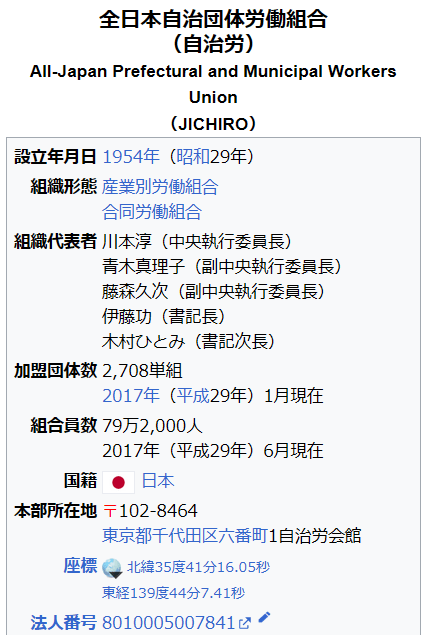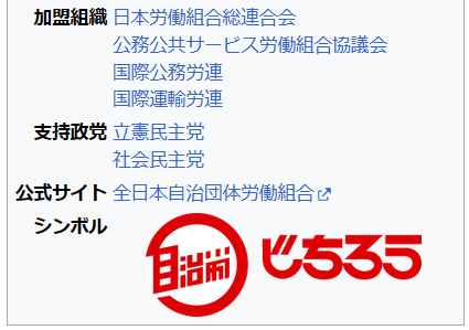 全日本自治団体労働組合https://ja.wikipedia.org/wiki/%E5%85%A8%E6%97%A5%E6%9C%AC%E8%87%AA%E6%B2%BB%E5%9B%A3%E4%BD%93%E5%8A%B4%E5%83%8D%E7%B5%84%E5%90%88