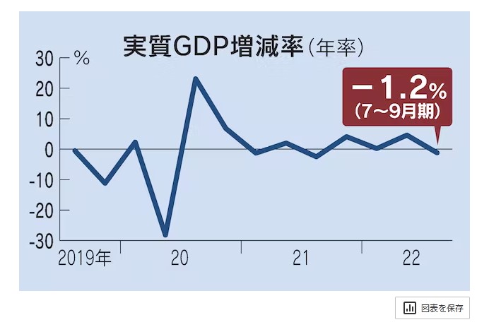 『内閣府が15日発表した7~9月期の国内総生産(GDP)速報値は、物価変動の影響を除いた実質の季節調整値で前期比0.3%減、年率換算で1.2%減だった。マイナス成長は4四半期ぶり。GDPの過半を占める個人消費は新型コロナウイルスの第7波などの影響で伸び悩み、前期比0.3%増にとどまった。