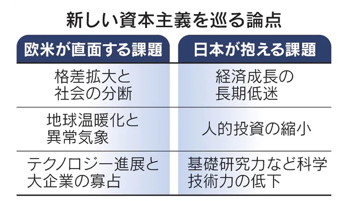 資本主義の見直しは世界の潮流だ。米欧では一部の富裕層にお金が集まる構造が社会分断を広げる。地球温暖化も持続可能な資本主義を求める議論を呼ぶ。26日の初会合に向けて事務方が作成した資料は世界の有識者による「新しい資本主義」の議論を紹介した。