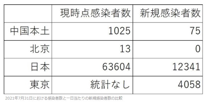 現時点(7月31日統計)での中国(本土)全体および北京の感染者数と(1日当たりの)新規感染者数を日本全国および東京と比較すると以下のようになる。