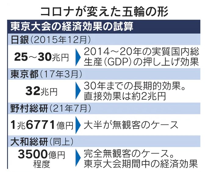『スポンサーのメリットがあるかと聞かれると言葉に窮する』。あるJOC(日本オリンピック委員会)ゴールドパートナーの担当者は打ち明ける。別のスポンサー企業は『無観客も一般の人と一緒で、報道で知った』と話し、組織委からの説明が不足する現状にも不満をにじませる。スポーツ文化評論家の玉木正之氏は『今大会でのスポンサーはメリットがまったくないといっても過言ではない』と強調。企業がPR計画を縮小する動きには『五輪に近づくと社名に傷が付くと感じ取り、うまく距離を取る企業が増えそうだ』と述べた」