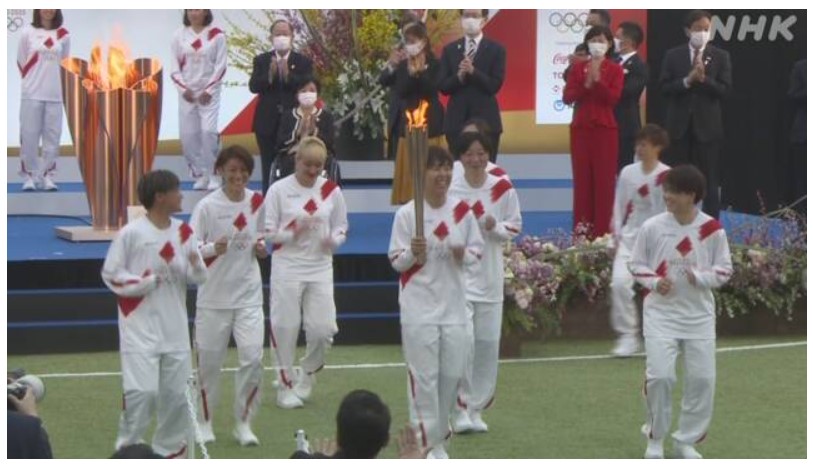 そして、桜をモチーフにしたトーチに聖火がともされると、2011年サッカー女子ワールドカップで優勝した日本代表「なでしこジャパン」の当時のメンバー16人が、トーチを手に最初の聖火ランナーとして走り始め、東京オリンピックの聖火リレーがスタートしました。