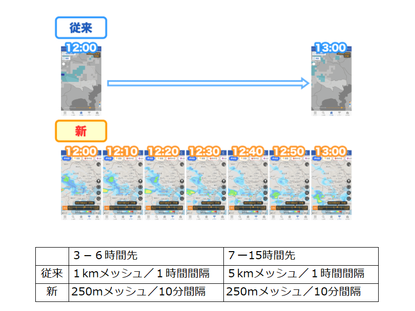 「革新的な進化だ」。ウェザーニューズ予報センターの西祐一郎グループリーダーは雨雲レーダーの大幅な高解像度化の成功に胸を張る。従来の雨雲レーダーでも3時間先までは250mメッシュかつ10分間隔で予測していたが、3-15時間先については1km-5kmメッシュかつ1時間ごとの予測だった。新しい雨雲レーダーは3時間先以降の予測を大幅に高解像度化した。