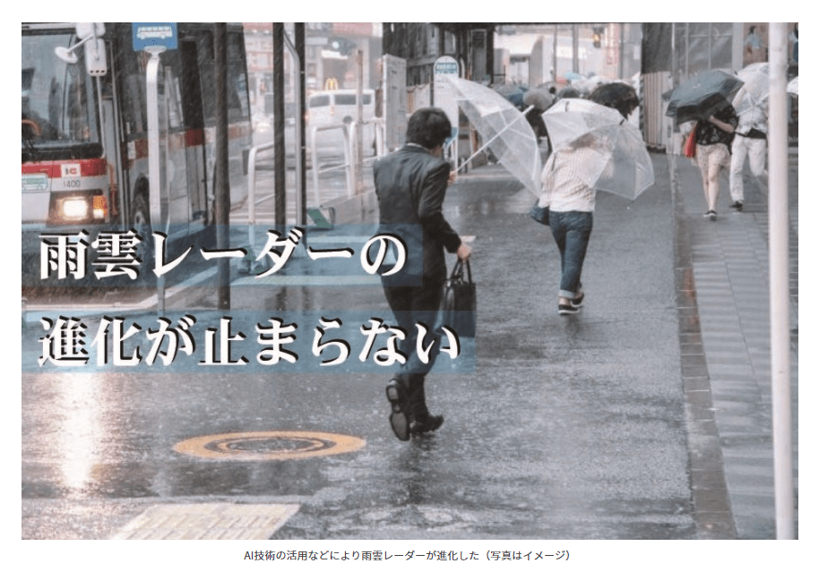 『雨がいつ、どこで、どれくらい降るかがスマートフォン上などで一目でわかる「雨雲レーダー」の進化が止まらない。民間気象会社のウェザーニューズは、半日以上先の降雨状況について250mメッシュかつ10分間隔という高解像度の可視化に業界で初めて成功した。スマートフォンアプリ「ウェザーニュース」で提供を始めた。同社が3時間先の降雨状況の高解像度化に成功したのはわずか2年前。雨雲レーダーがこれほど短期間で進化した背景には人工知能(AI)技術がある。(取材・葭本隆太)