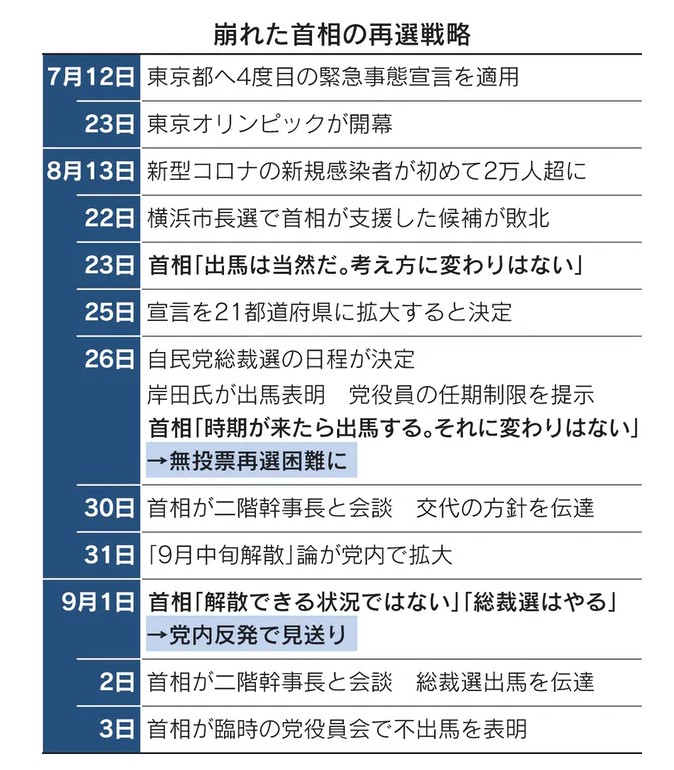 菅首相に近い政治ジャーナリストの田崎史郎氏は9月4日、日本テレビ系の番組で「大きく局面が変わったのは、8月31日の火曜日の夜に、9月中旬に解散、総裁選を先送りするんだという報道が流れて、水曜日朝の毎日新聞にその記事がそのまま出たんですね。それで党内の空気がガラっと変わって、総裁選先送りなんて許されないってことになって、一段と菅離れが進んだ」と解説した。