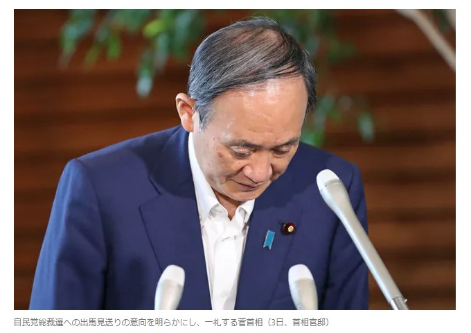 3日午前11時17分、悲壮な表情をした菅首相が自民党本部に入った。二階俊博幹事長と面会し、総裁選不出馬を伝えた。各種報道によると、二階氏は慰留をしたという。午前11時34分、臨時役員会が始まり、菅首相は総裁選不出馬の意向を表明し、約6分で退出した。