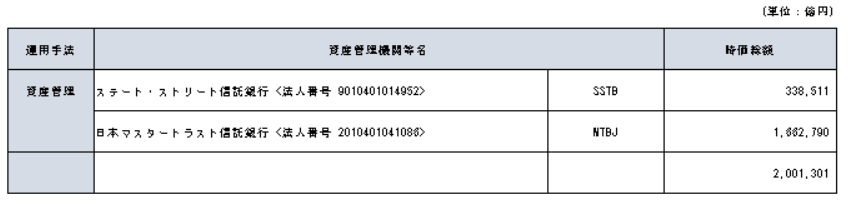 運用方法は運用受託機関(信託銀行や投資顧問会社)との投資一任契約ないし一部の自家運用による。