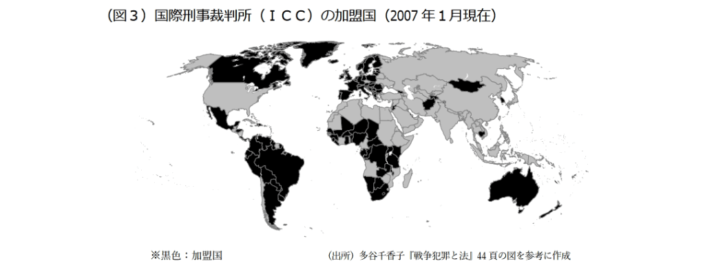 I CCの加盟国は、本年1月現在で104か国であり、ヨーロッパ諸国及びラテンアメリカ 諸国のほとんど、アフリカ諸国の多くが加盟国となっている(次頁の図3参照)。 しかし、国連安保理常任理事国5か国のうち、加盟しているのは英仏のみであり、米国、 ロシア、中国は未加盟である。I ccと国連は密接な関係にあり、加えて安保理がI CC に対する事案の付託権限や捜査の停止権限を持っていることを考えると、I CCが常任理 事国のうち2か国の支持しか得ていないことは大きな問題である。 また、地域別に見ると、アジアの加盟国が極めて少ないことが特徴的である。アジア諸 国で加盟しているのは、韓国、モンゴル、カンボジア、東ティモール、アフガニスタン、 タジキスタンなどに限られており、人口の多い中国、インド、インドネシアなどといった 国が加わっていない。世界人口の6割を占めるアジアからの加盟国が少なく、特に主要国 が未加盟であることは、現在I cc内部においても最大の懸案の一つになっている。 26 立法と調査 2007. 3 No. 265 (図3)国際刑事裁判所(ICC)の加盟国(2007年1月現在) ※黒色:加盟国 (出所)多谷千香子『戦争犯罪と法』44頁の図を参考に作成 なお、我が国は、I CC規程の採択に当たっては賛成票を投じたが、署名期間内に署名 せず、条約発効後もこれまでI CCへの加盟を見合わせていた。その理由について、政府 は、「国内法を整備する必要があり、その形式及び内容を検討中である」、「財政状況が厳し い中で分担金等の費用負担の問題を解決する必要がある」などと説明していた8。