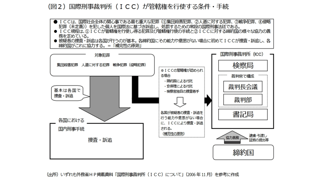 国際刑事裁判所(ICC)とは何か ~国際刑事裁判所ローマ規程の国会審議に当たって~ 外交防衛委員会調査室 中内康夫https://www.sangiin.go.jp/japanese/annai/chousa/rippou_chousa/backnumber/2007pdf/20070302023.pdf