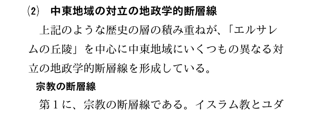 上記のような歴史の層の積み重ねが、「エルサレムの丘陵」を中心に中東地域にいくつもの異なる対立の地政学的断層線を形成している。