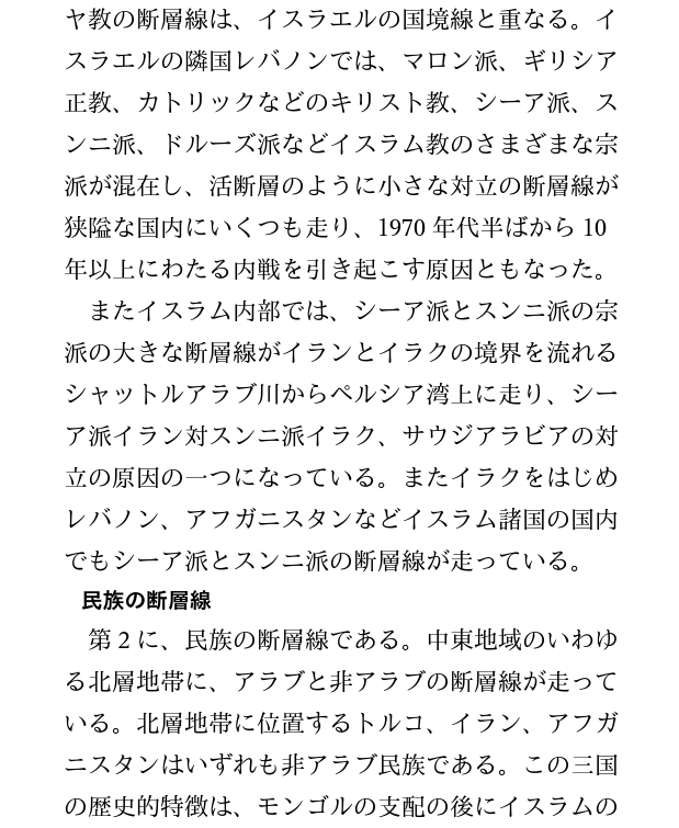 またイラクをはじめレバノン、アフガニスタンなどイスラム諸国の国内でもシーア派とスンニ派の断層線が走っている。