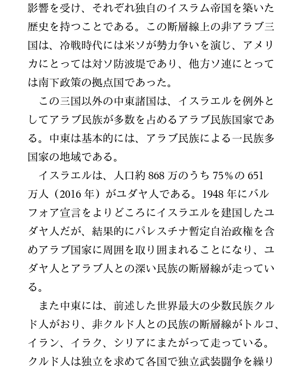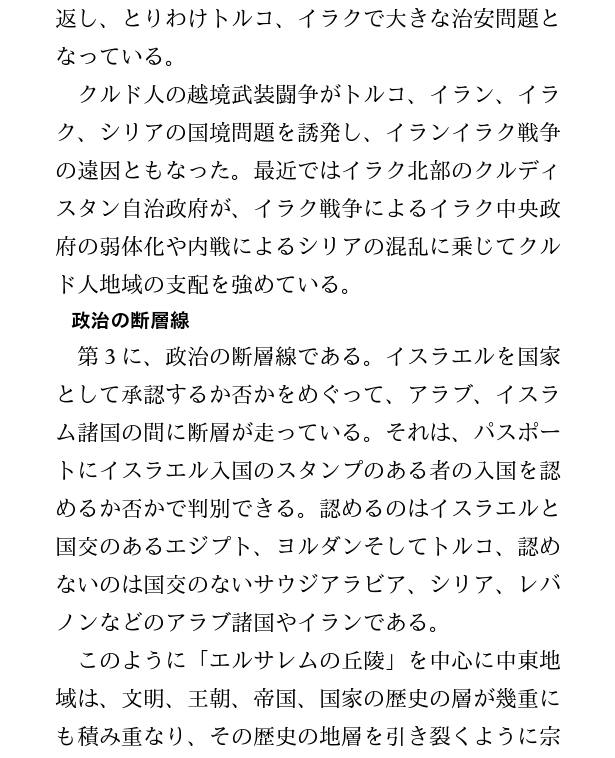 そして中東地域の歴史の表層には、国境線によって切断・包囲された文明、宗教、宗派、民族の対立が刻み込まれた。