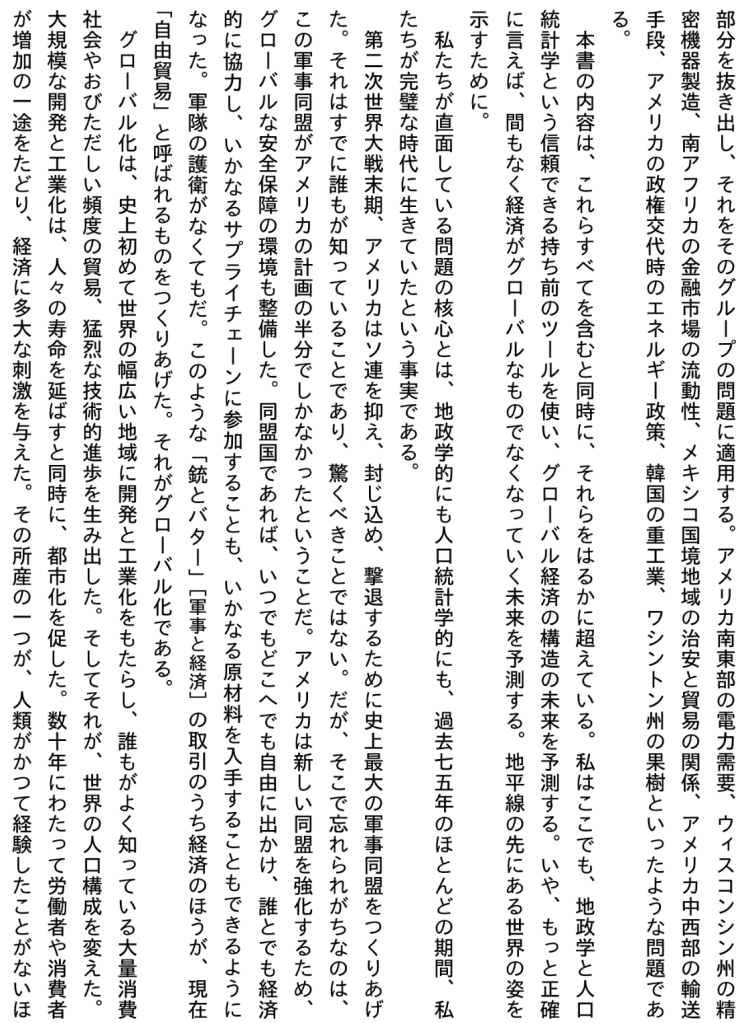 アメリカを中心とする自由主義陣営の諸国の結びつきは、地政学理論にそって言えば、「海洋国家」が結びついたネットワークのことだ。ハルフォード・マッキンダーに代表される「英米系地政学理論」の伝統にそって言えば、冷戦構造とは、ユーラシア大陸中央部の「ハートランド」に位置しつつ、海に向かって膨張政策をとってくる「陸上国家」を、「海洋国家」連合が封じ込めていく構造のことであった。冷戦終焉後の「リベラル国際秩序」とは、「陸上国家」の膨張が止まった後、「海洋国家」諸国がより自由にグローバルに影響力を行使するようになった時代の秩序のことであった。』