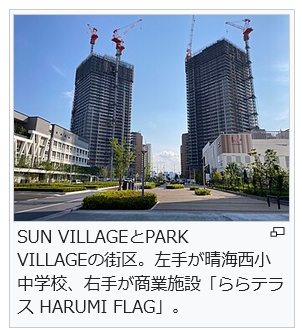 SUN VILLAGEとPARK VILLAGEの街区。左手が晴海西小中学校、右手が商業施設「ららテラス HARUMI FLAG」。