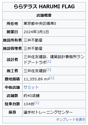 ^ a b 清宮信志 (2023年4月6日). “五輪選手村跡地に商業施設「ららテラス HARUMI FLAG」 24年春開業”. Impress Watch 2023年4月10日閲覧。