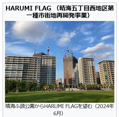^ “不動産ニュース 「HARUMI FLAG」、11月販売の全631戸に申し込み”. 不動産流通研究所. (2021年12月2日) 2021年12月28日閲覧。