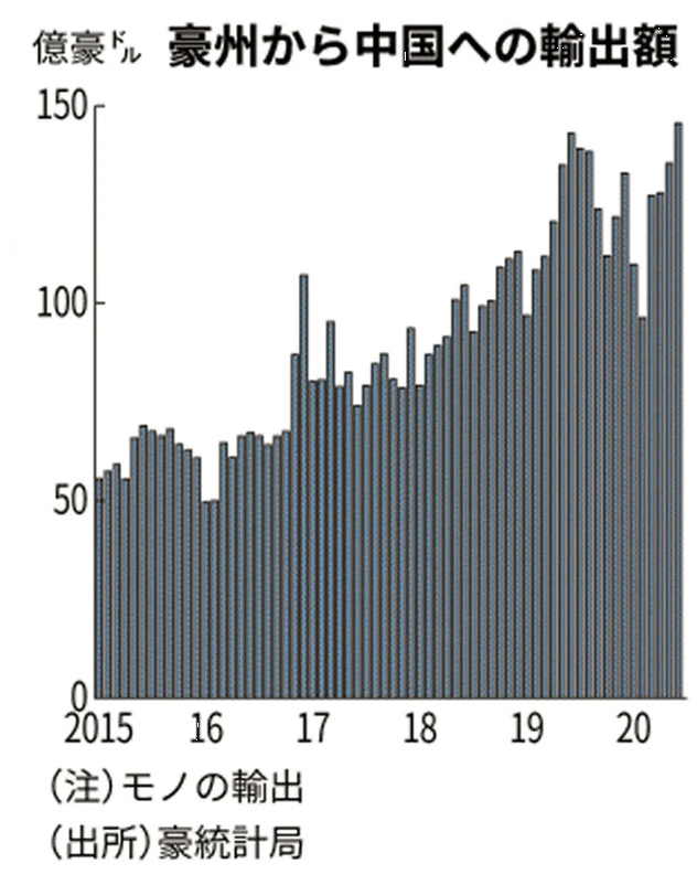一方、豪州は中国と外交や安保で緊張を高めている。モリソン豪首相が新型コロナの発生源などについて独立調査を求めると中国が反発。5月には豪産の食肉の輸入を一部規制し、大麦に80%超の追加関税を課した。