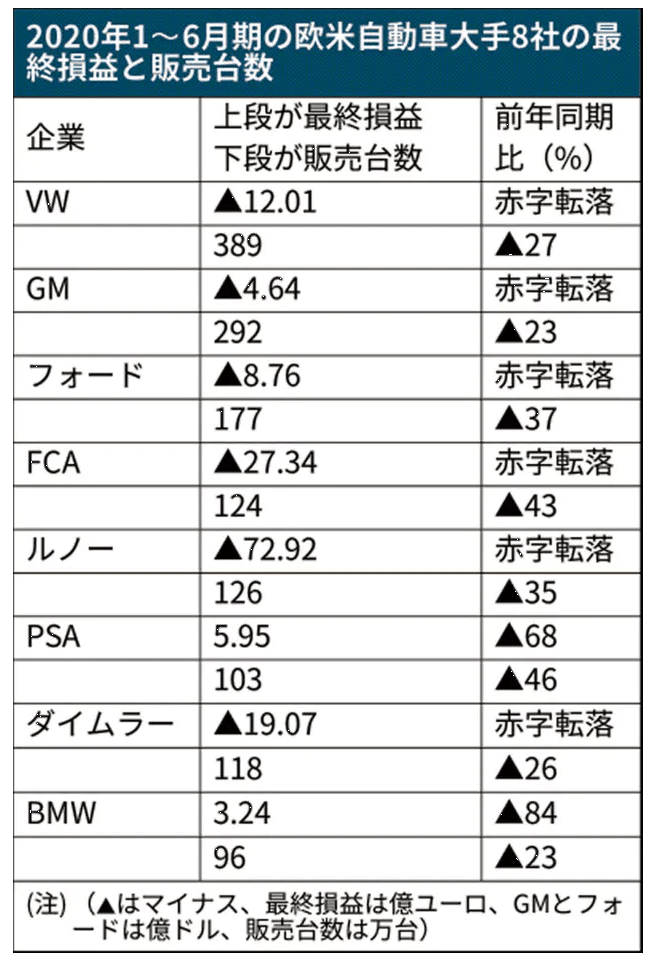『【フランクフルト=深尾幸生、ニューヨーク=中山修志、パリ=白石透冴】欧米自動車大手8社の2020年1~6月期の決算が5日出そろい、独BMWと仏グループPSAを除く6社が最終赤字になった。新型コロナウイルスで新車販売が約3割落ち込んだことが響いた。市場の本格回復には時間がかかるとみられ、各社は追加のリストラを加速している。』