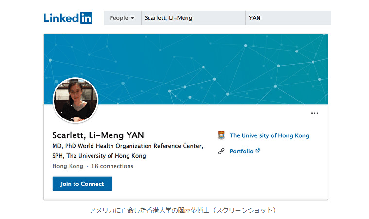 亡命したのは中国青島出身の閻麗夢(えん れいむ)博士で、世界保健機関(WHO)のリファレンス研究施設として指定されている香港大学公共衛生学院の研究室に所属していた。