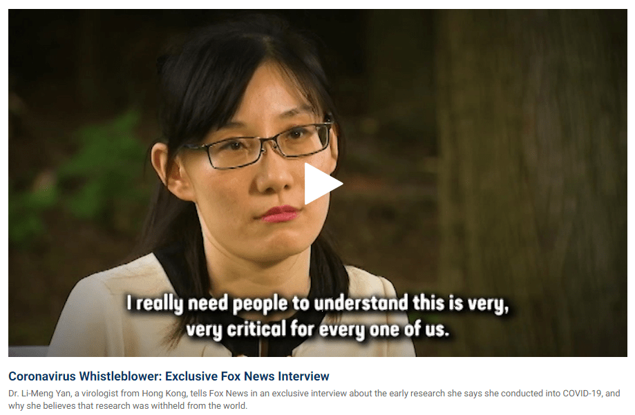 (グーグル翻訳文) 『独占:中国のウイルス学者がコロナウイルスの隠蔽を北京で非難、香港を逃れる:「私は彼らが内部告発者をどのように扱うか知っています」 Li-Meng YanはFoxニュースに対し、中国がコロナウイルスについて知っていたと確信する前に、中国がそれを知っていると信じていると語った。彼女は、彼女の上司もまた、命を救うことができたと彼女が信じている彼女が行っていた研究を無視したと言います。 独占: 香港の科学者であるLi-Meng Yan博士が未知の領域に足を踏み入れました。