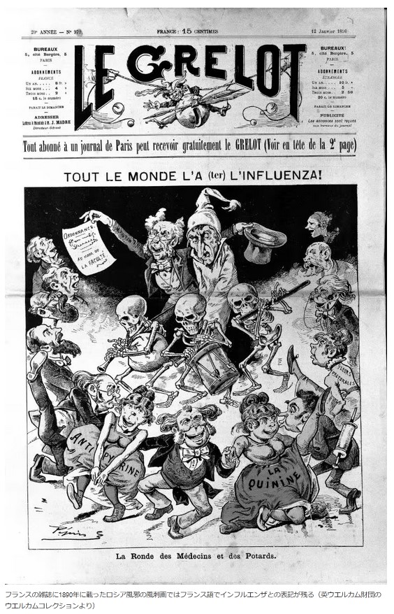 フランスの雑誌に1890年に載ったロシア風邪の風刺画ではフランス語でインフルエンザとの表記が残る(英ウエルカム財団のウエルカムコレクションより)