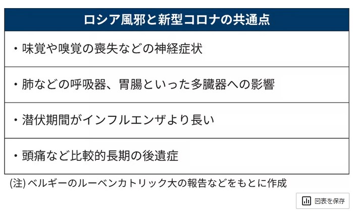 ベルギーのルーベンカトリック大学の研究チームは2021年夏、「ロシア風邪の英国とドイツでの医療報告は新型コロナと多くの特徴を共有している」と論文で報告した。肺や気管支、胃腸の症状のほか、味覚や嗅覚の喪失などを含む神経への影響だ。新型コロナでは「ロング・コビッド」と呼ぶ後遺症も似ていた。