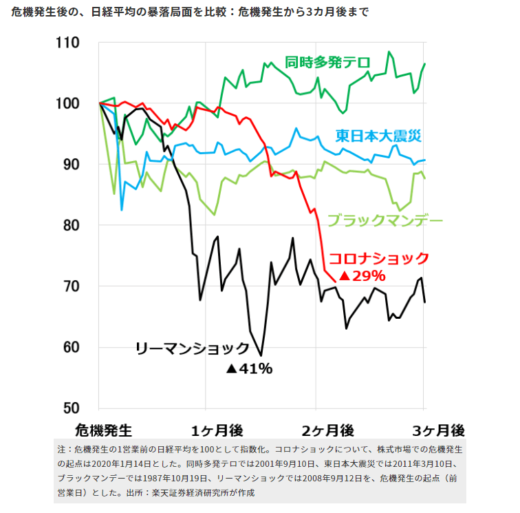 ※ この「比較のグラフ」が、分かりやすい…。それぞれの「危機発生時の価格を100」として、それから「どのくらい下げたのか」を指数化したものだ…。「コロナ、大暴落の時」は、30%くらい下げたんだな…。