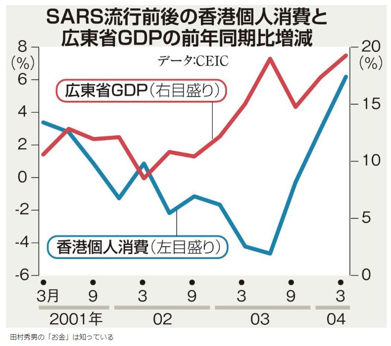 『参考になるのは、SARS流行時の香港と広東省の経済動向だ。グラフはSARSの流行前から消滅時にかけての香港の個人消費と広東省の省内総生産(GDP)の前年同期比の増減率推移である。香港では、ふだんは喧騒に包まれている繁華街に出かける人の数が少なくなったと聞いた。広東省は上海など長江下流域と並ぶ「世界の工場」地帯で、生産基地が集積している。