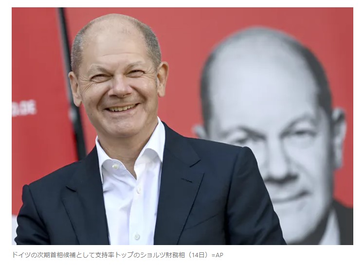 ドイツの次期首相候補として支持率トップのショルツ財務相(14日)=AP