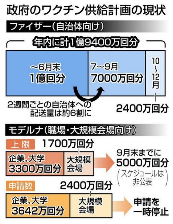 これまではファイザーから6月末までに1億回(5000万人)分を供与される予定だった。65歳以上の全ての高齢者が2回接種できる量を6月までにまかなえる算段がついた。その後に控える一般向け接種の確実な道筋は描けていない。