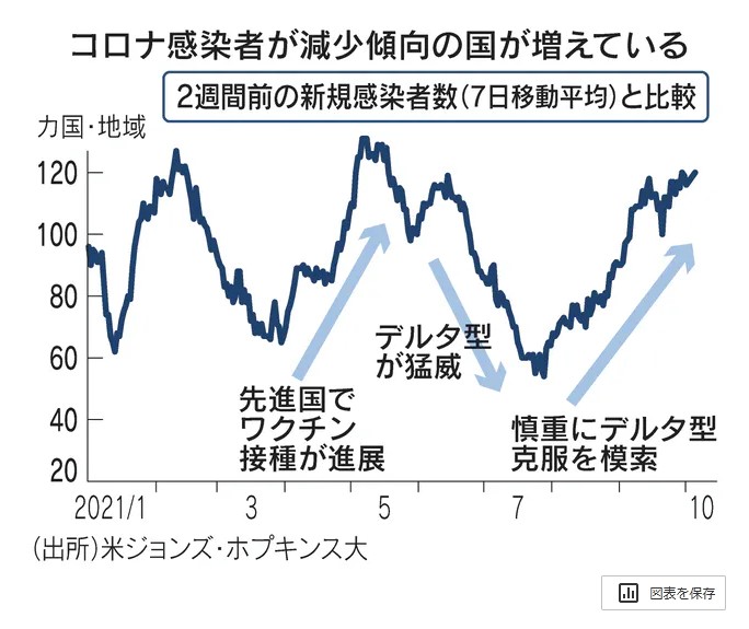 日本は感染者が急減しているが、今後の再拡大を警戒する声もある。日本でワクチンを2回接種した人は全人口の75%を超え、主要7カ国(G7)ではトップだ。しかし、今後は感染症が流行しやすい冬に入り、経済活動の再開で人流が増える。