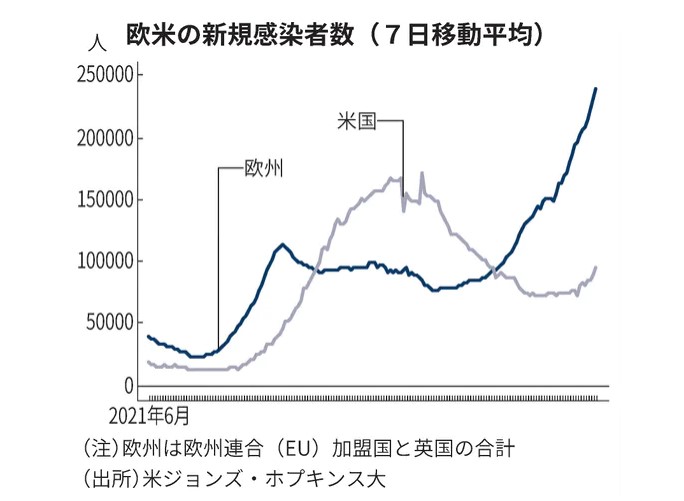 欧州で感染拡大が際立つ理由は明らかではない。ワクチン接種の開始時期が早く、接種完了からの時間経過で予防効果が薄れている、行動制限の緩和が拙速だった、マスク着用などの予防策が徹底されていない、などの指摘もある。