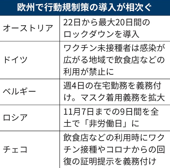 1日あたりの感染者は1万5000人前後と急増している。政府はワクチン接種完了率が6割台と欧州主要国と比べ低いことへの危機感が強く、来年2月からは接種を義務化するなど、一段と厳しい対策に踏み込んだ。