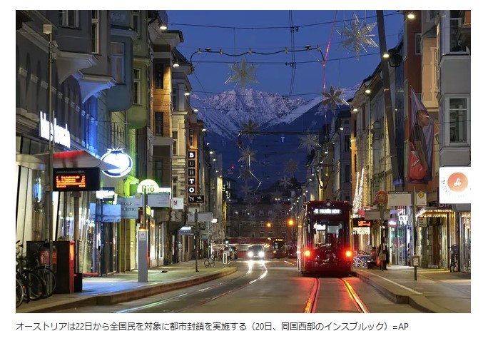 オーストリアやドイツは直近2週間で過去最高を記録し、オーストリアは22日から全国民を対象にロックダウンを実施する。食品の買い出しや通院を除き外出禁止となる。