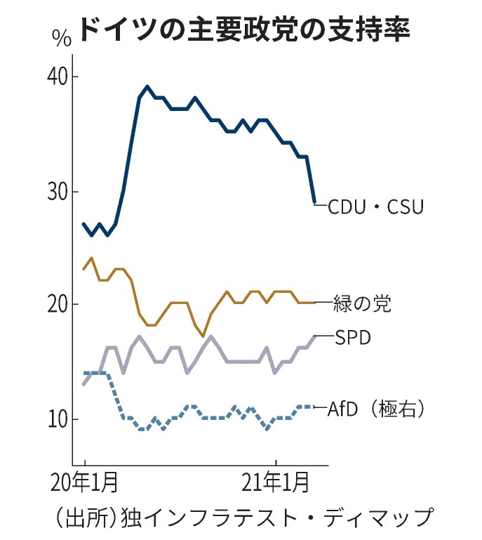 『【ベルリン=石川潤】ドイツの連邦議会選挙(総選挙)が半年後に迫るなか、メルケル首相の与党、キリスト教民主・社会同盟(CDU・CSU)の支持率が急落している。新型コロナウイルスの感染が再び広がるなかでワクチンの市民への接種が遅れたことが響いており、メルケル首相への支持も落ち込んでいる。支持率2位の環境政党、緑の党との差は急速に縮まっており、総選挙後の政権交代シナリオも現実味を帯びてきた。