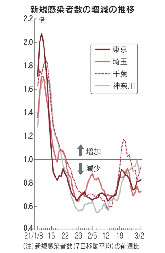 一つ一つの指標を比べると、2月末に先行解除した6府県より1都3県の状況は厳しい。人口10万人当たりの1週間の新規感染者数は解除時の6府県は1桁台にまで下がっていたが、東京や千葉は13~14人だ。