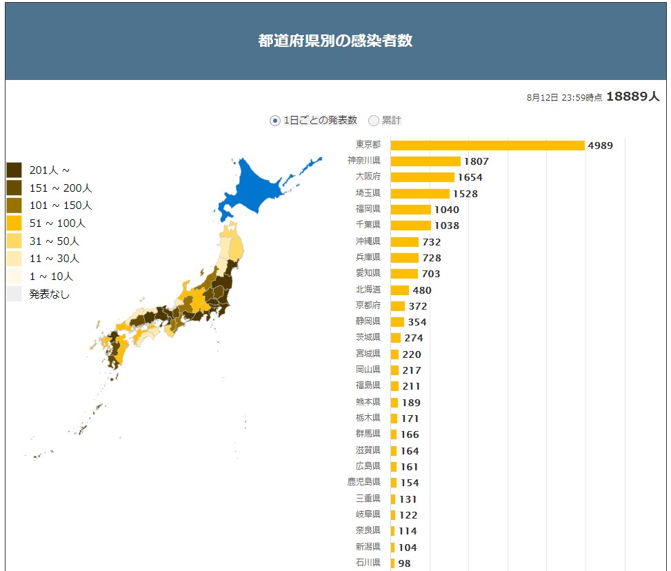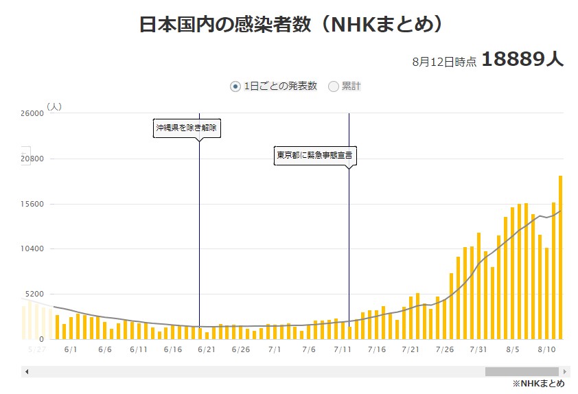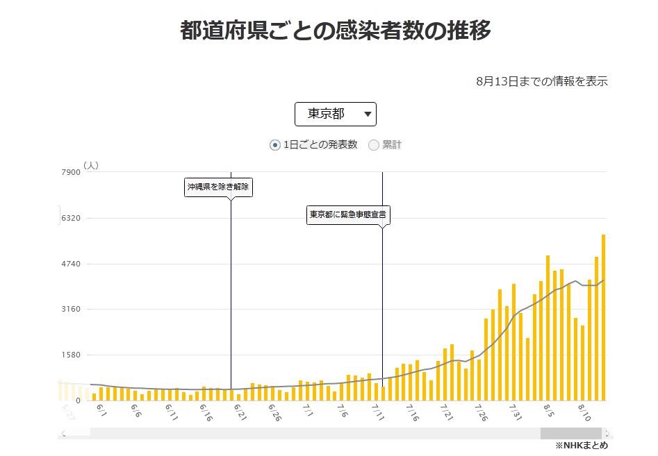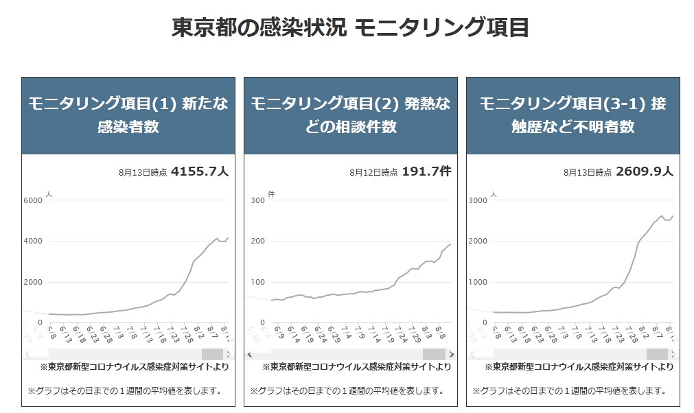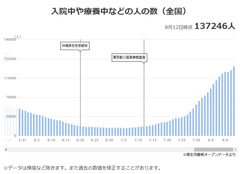 厚生労働省によると「自宅療養者等」と「療養先調整中」の合計人数(8月18日時点)は全国では12.7万人で、7月21日時点の1.4万人から急増した。都内でも0.6万人から3.4万人に増え、増加傾向が続く。