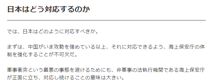 ※ 確かに、「東京の郊外より…」さんが、唖然としたように、第一列島線内部に生活している日本国民の立場からすれば、「総員玉砕しても、死守しろ!外部から反撃するまで、持ちこたえろ!」と言われているようにしか、聞こえないな…。