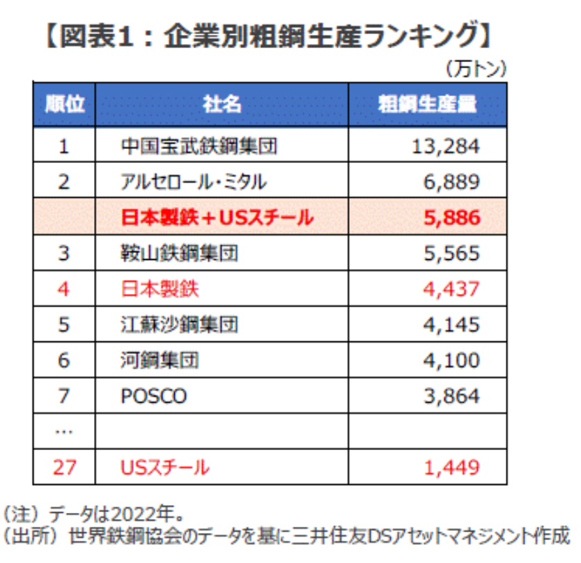 ■このため、日本製鉄にとってUSスチールが持つ米国内の高炉8基(うち2基は休止中)、電炉5基(うち2基は建設中)の生産能力は魅力的な資産といえそうです。もし、こうしたUSスチールの設備に日本製鉄の技術を導入すれば、その生産性、生産量はともに伸びる可能性が高く、今回の買収提案は魅力的な成長戦略と言ってよさそうです。また、USスチールは環境技術に優れた最先端の電炉メーカーを子会社に抱える上に、両社統合後の粗鋼生産高は世界3位の規模まで拡大する点も、買収のメリットとすることができそうです (図表1)。