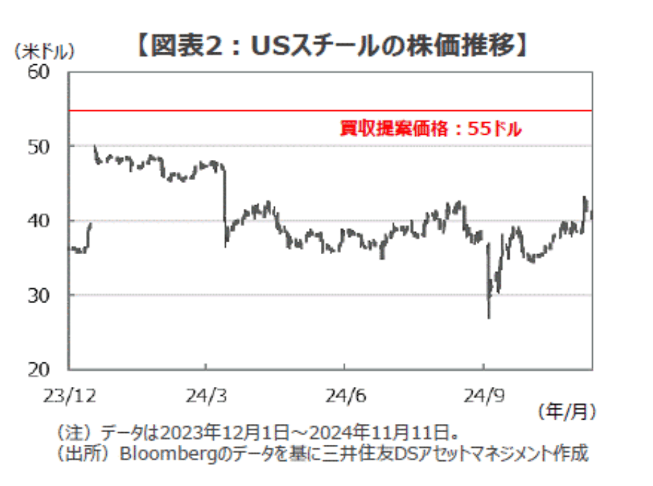■USスチール買収に自信を見せる日本製鉄の説明とは裏腹に、市場では買収成功に懐疑的な見方が広がっているように思われます。日本製鉄は昨年12月にUSスチール株を1株55ドル(時価39.33ドルに 約40%のプレミアムを加えた価格)、総額約141億ドルで買収すると発表しました。そして、買収提案の発表直後に株価は急騰し、一時50.20ドルの高値を付けました。しかし、今年3月15日にバイデン大統領が買収への反対を表明したことをきっかけに株価は急落し、足元では買収提案前の株価水準となる40ドル近辺での推移となっています。