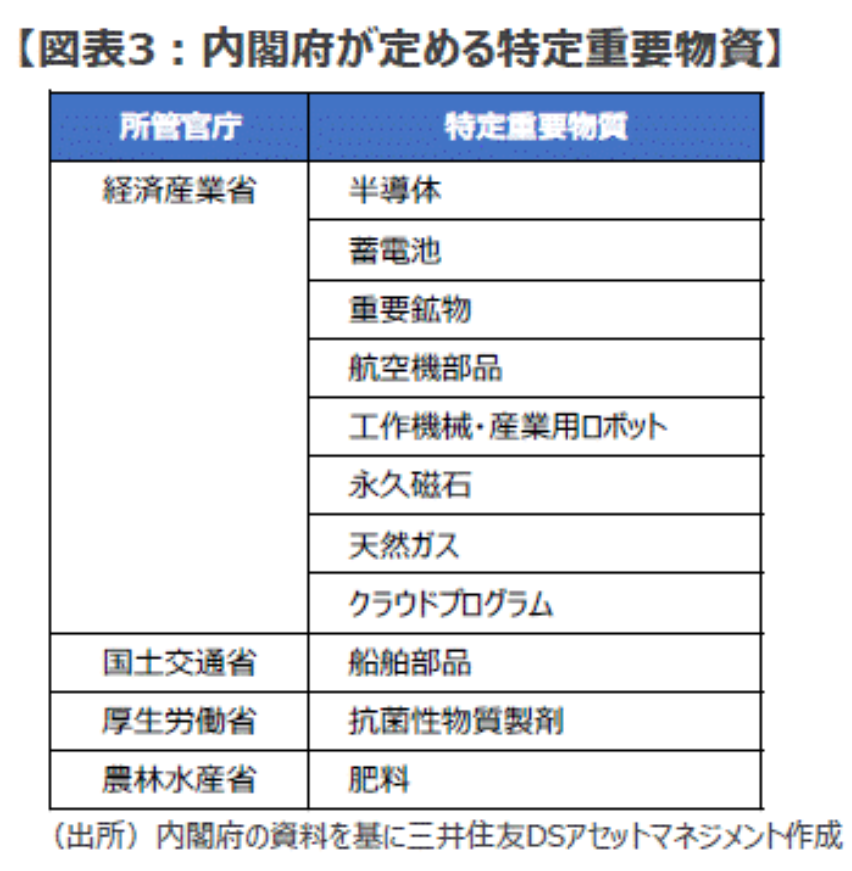 ■日本でも近年、経済安全保障を重視する動きが広がっています。2022年12月20日には、内閣府が経済安全保障推進法が定める「特定重要物資」として、半導体や蓄電池など11の物資を指定しています(図表3)。この重要物資を見ていくと、リチウム、ニッケル、コバルト、マンガンといった「重要鉱物」は鉄と混ぜて精錬することで合金鉄を作る素材ですし、「航空機部品」、「工作機械・産業用ロボット」、「永久磁石」、「船舶部品」といった重要物資の主な原材料は鋼材ですから、鉄鋼生産はこうした重要物資の「サプライチェーンの上流」に位置していることが確認できます。