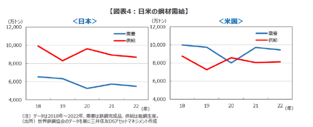 ■国内の鉄鋼需要の頭打ちから、日本の大手鉄鋼メーカーは海外ビジネスに活路を見出しています。米国は、中国やインドに次ぐ世界3位の鉄鋼消費国ですが、鉄鋼完成品の需要が年9,453万トンに上る一方、粗鋼生産は同8,053万トンにとどまり、米国内に限れば供給不足の状況にあります(2022年)。