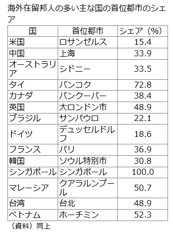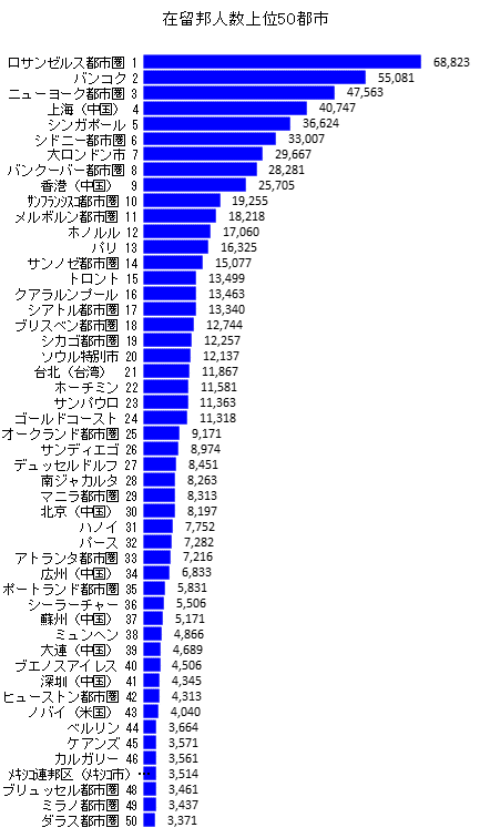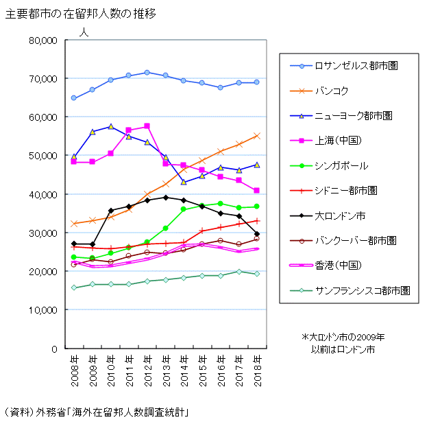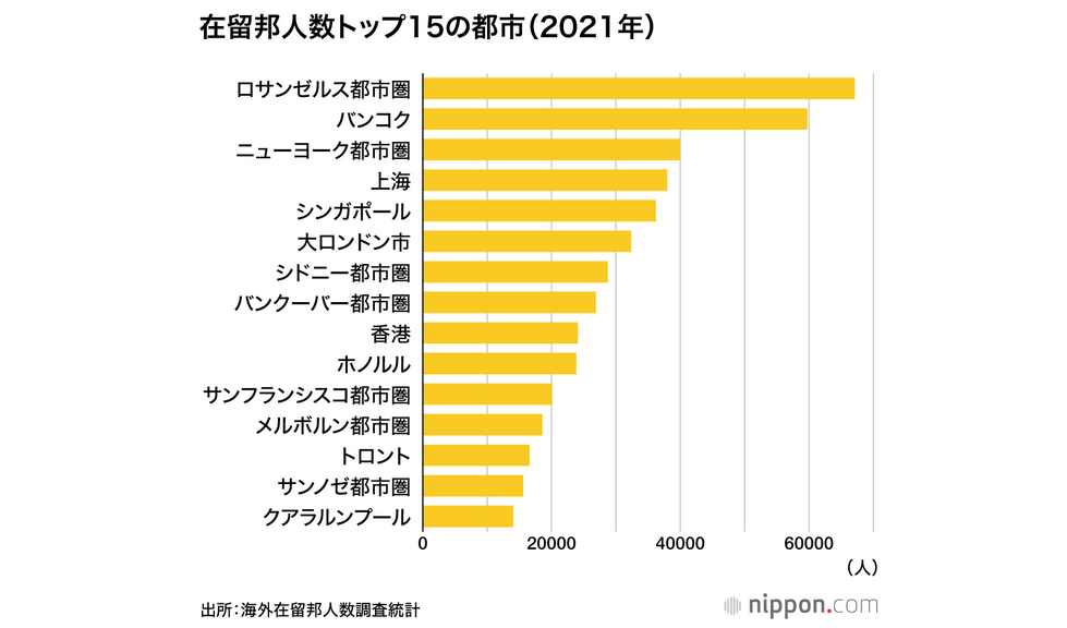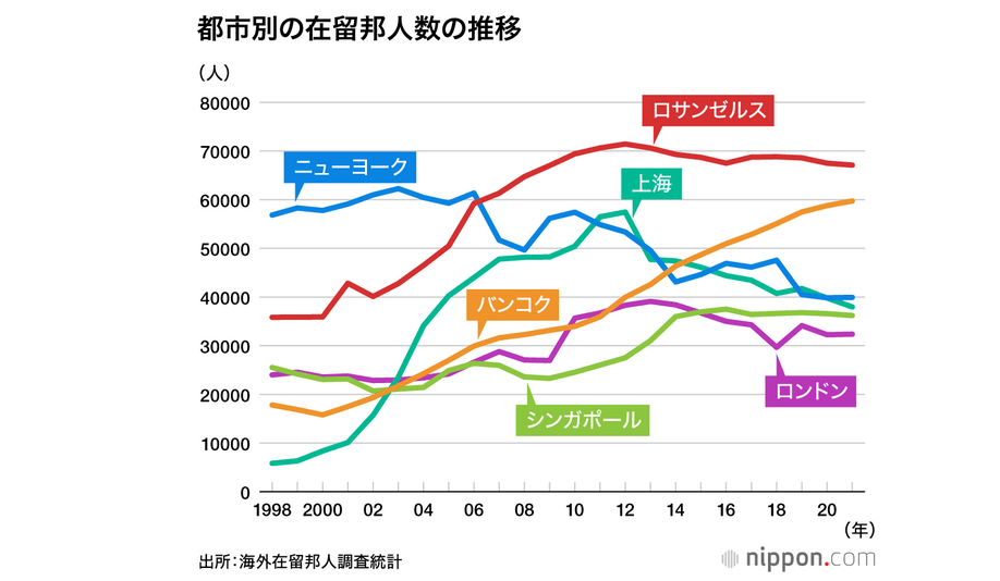都市別の在留邦人数トップはロサンゼルス都市圏(米国)の6万7000人。次いでバンコク(タイ)5万9000人、ニューヨーク都市圏(米国)3万9000人、上海(中国)3万7000人、シンガポール3万6000人、大ロンドン都市圏(英国)3万2000人と続く。10年前の11年と比べると、バンコクが2万人以上増加した一方、上海は1万9000人、ニューヨークは1万5000人もそれぞれ減少している。